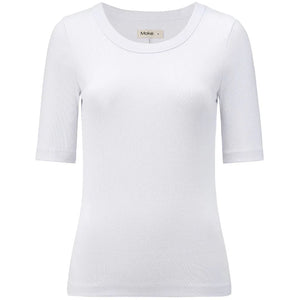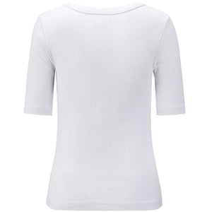 This fitted tee is designed to do all the right things — it shapes, smooths, and flatters without clinging. Made from a soft cotton-spandex rib, it moves with you while holding its shape, giving you that sleek, pulled-together look with zero fuss.