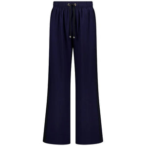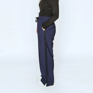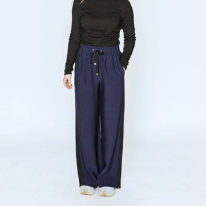Crafted from a lightweight, breathable viscose-nylon blend, the Indiana Wide-Leg Pants offer a relaxed yet elevated look for any occasion. Designed for versatile wear, they feature sleek black contrast stripes down each leg and side splits at the hem, adding a modern touch to their flowing silhouette.