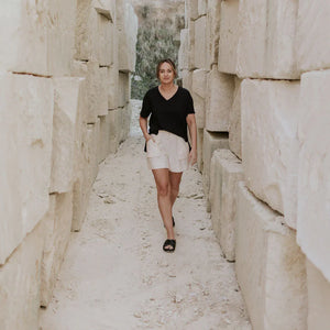 Crafted in a beautifully soft, breathable Viscose Nylon. These shorts feature an elasticated paper bag drawstring waist, complete with pale gold eyelets and stoppers for a polished finish. Complete with front and back pockets these shorts can be dressed up or down for every summer occasion. While doing a shoot a couple of the ladies mentioned that they "don't wear shorts". However, these have now made it onto their wish list for summer!
