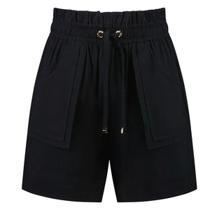 Crafted in a beautifully soft, breathable Viscose Nylon. These shorts feature an elasticated paper bag drawstring waist, complete with pale gold eyelets and stoppers for a polished finish. Complete with front and back pockets these shorts can be dressed up or down for every summer occasion. While doing a shoot a couple of the ladies mentioned that they "don't wear shorts". However, these have now made it onto their wish list for summer!