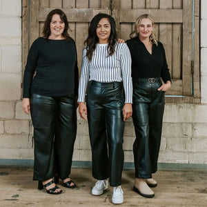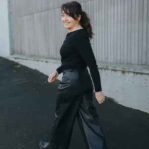 A high-waisted and wide-legged pant, June is made of a beautiful suede-back faux leather with a natural goat grain finish. This soft touch fabrication has an amazing hand feel and tailors exceptionally well. Whether for workwear or a night out, you'll stand out in all the right ways when wearing our June pants!