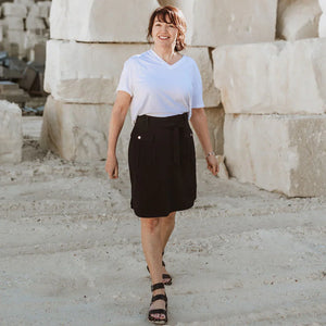 Mid length, high waisted skirt made in a luxurious lightweight Viscose Nylon fabric. Featuring a fly front closure, front pockets with pale gold buttons and a curved hemline with side splits. Wear me casually with a tee to all those summer BBQ's coming up or dress me up and pair me with a shirt for work!