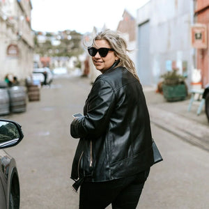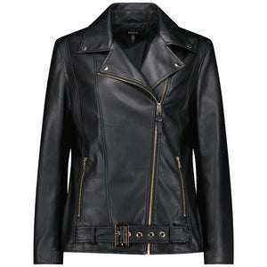 Your quintessential biker jacket, Lou features a beautiful quality faux leather with suede backing. With a natural leather look it has the soft hand feel you'd expect from a fine, real skin - but you can wear it with a clear conscience! Featuring pale gold hardware and a traditional biker belt, the Lou just screams rock 'n' roll!
