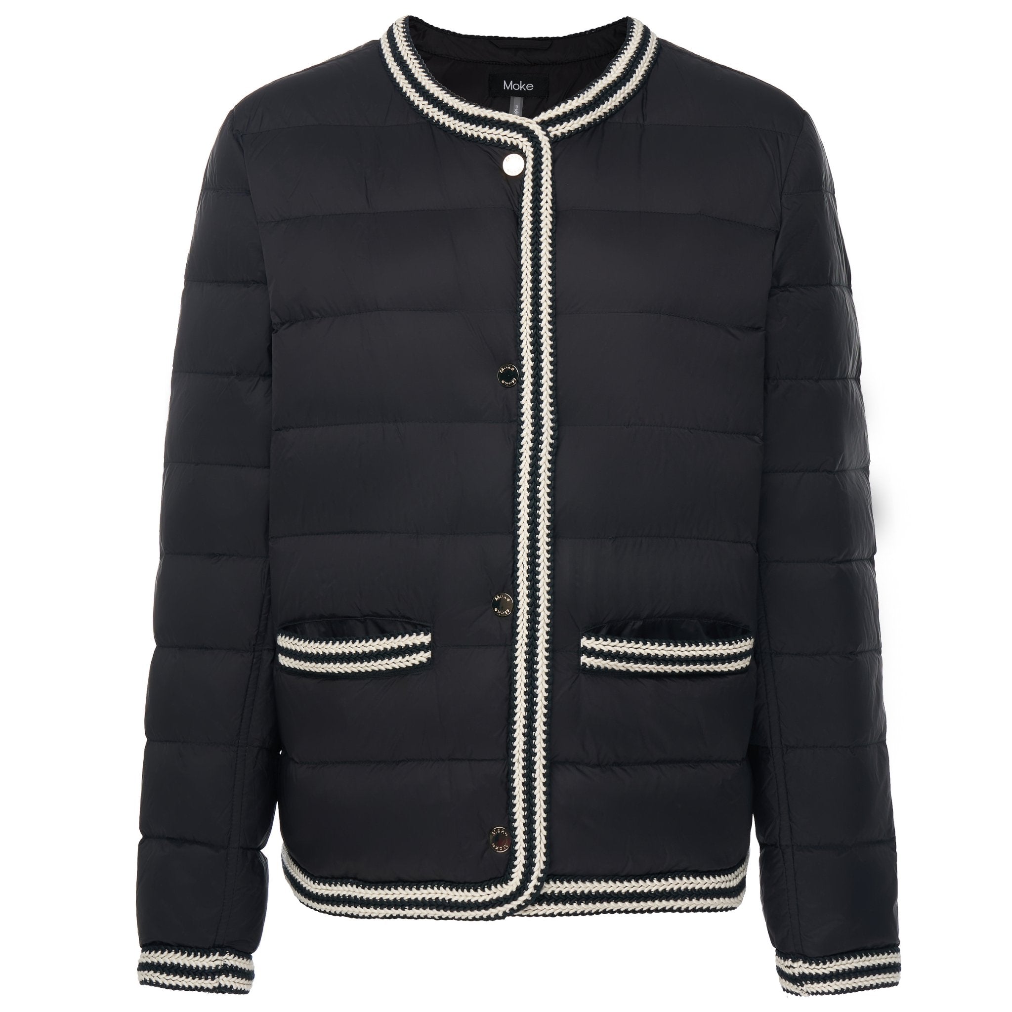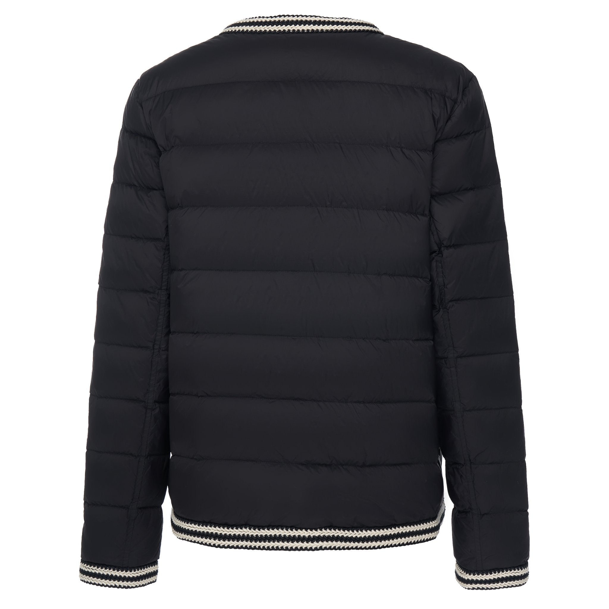 Crochet knit trim at the hems and cuffs adds texture and softness, bringing a subtle handcrafted feel that sets Fern apart from traditional puffers. An exposed snap-front closure with branded metal hardware keeps the silhouette clean, contemporary, and confidently polished.