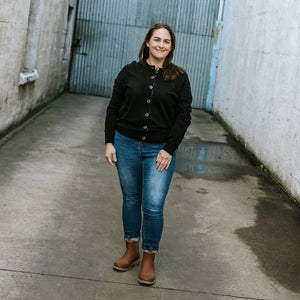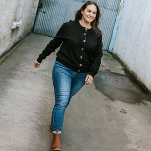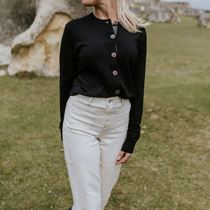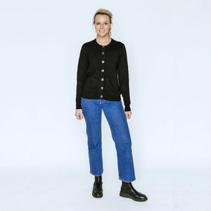 A versitle knitwear essenstial and a true wardrobe staple. This Ainslee cardigan knitted in a soft Rayon blend has a relaxed fit. A ribbed placket is complemented with a satin finish on the inside. A moke gold rimmed buttons to finish the look. Wear with a tank or t-shirt or layer under one of your Moke jackets.