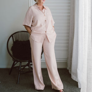 These wide-leg pants are your go-to for easy, elegant dressing. Cut from a luxe blend of viscose, lyocell, and linen, they offer a silky, weightless feel that skims rather than clings - the kind of flattering fit that works beautifully on every body.
