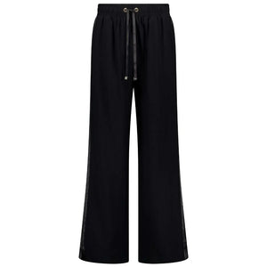 Crafted from a lightweight, breathable viscose-nylon blend, the Indiana Wide-Leg Pants offer a relaxed yet elevated look for any occasion. Designed for versatile wear, they feature sleek black contrast stripes down each leg and side splits at the hem, adding a modern touch to their flowing silhouette.