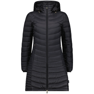 A lightweight long walker-length lightweight packable down coat with Moke's signature fantastic warmth-to-weight ratio. The Judy features fashionable curved quilt lines and has a removable hood.