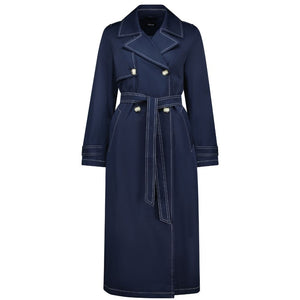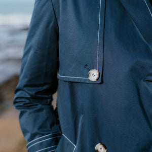 A traditional trench coat, Kim features a contrast top stitch and dressed-up satin lining, along with all the features you'd expect of a trench coat: epaulettes, storm flap, buckled sleeve straps, and more! Produced in a high-end tailored manufacturing facility, the Kim is a true tailored raincoat, and fully fused.